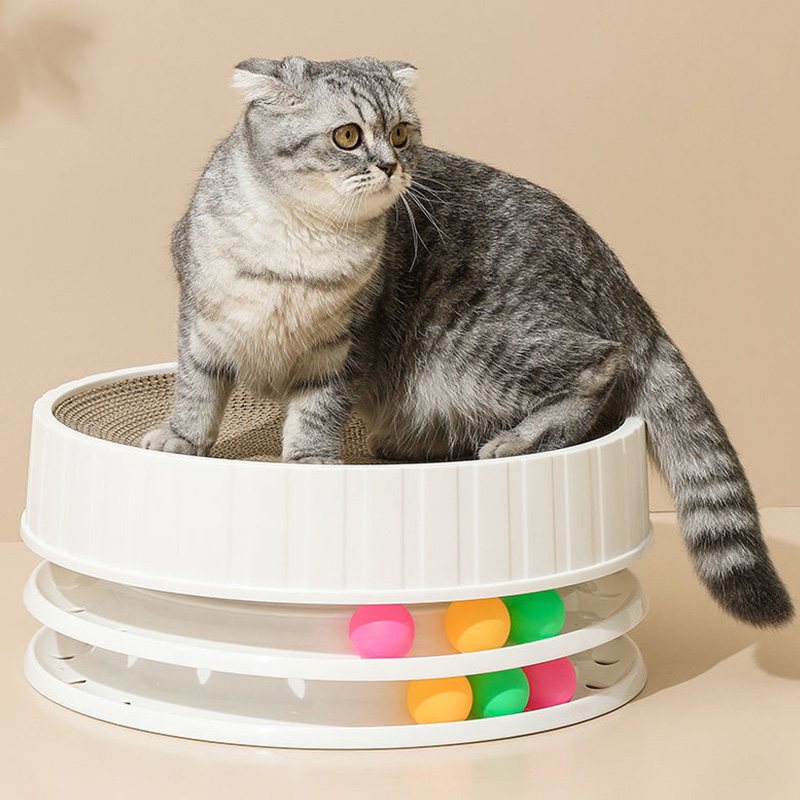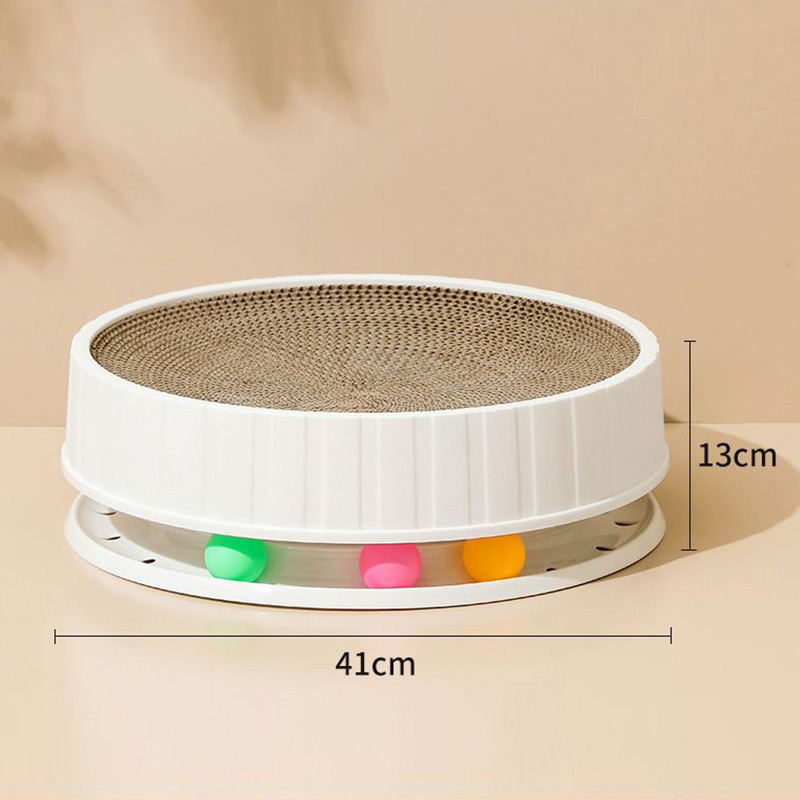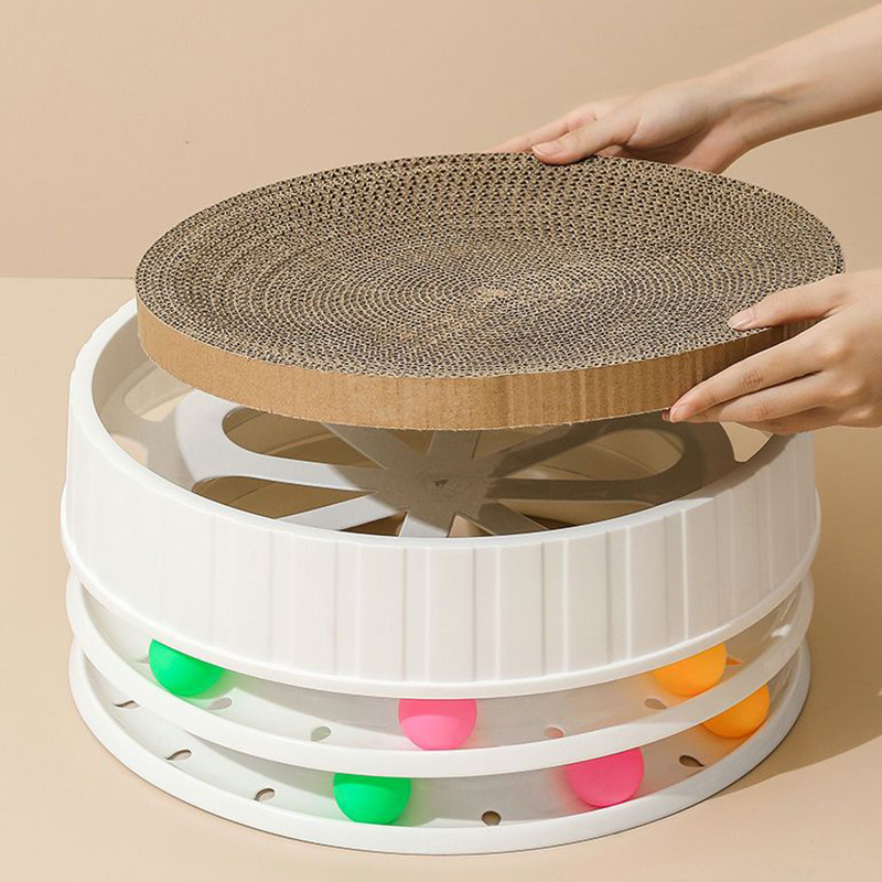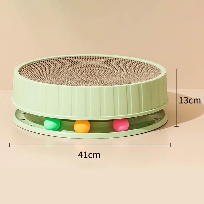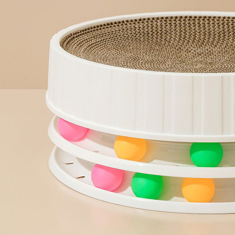 La capa superior presenta una textura corrugada que imita la sensación de los materiales naturales, lo que anima a los gatos a rascar y afilar sus garras de forma eficaz. Esta textura también puede ayudar a eliminar el pelo suelto y mantener las garras del gato sanas. La capa inferior, equipada con bolas de colores, añade un elemento interactivo que estimula los instintos de caza del gato, convirtiéndolo no sólo en un rascador sino también en un juguete.