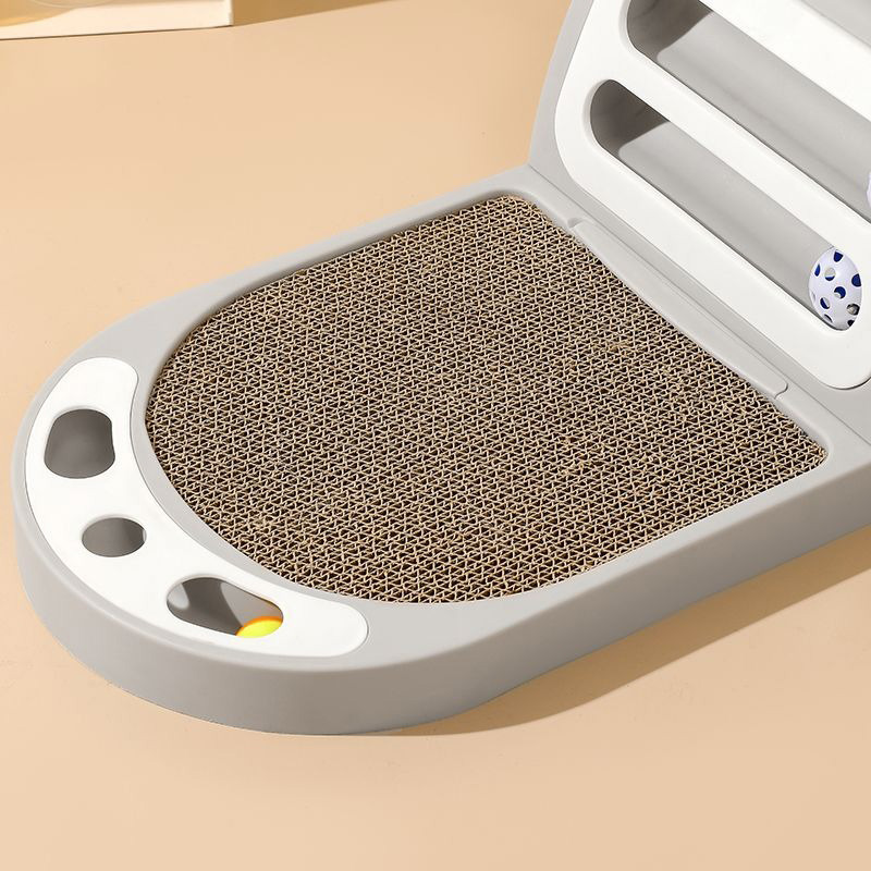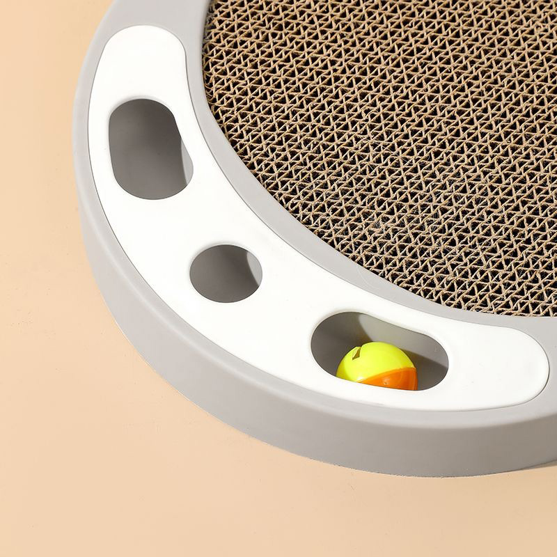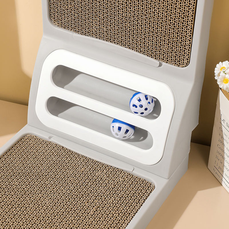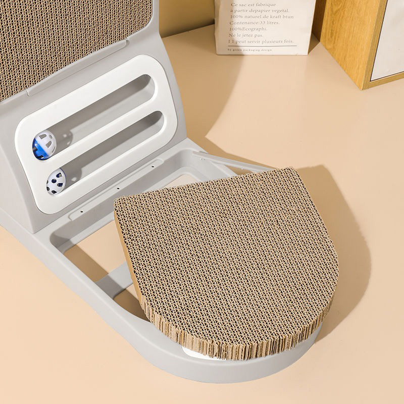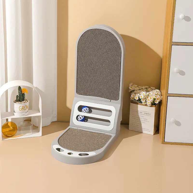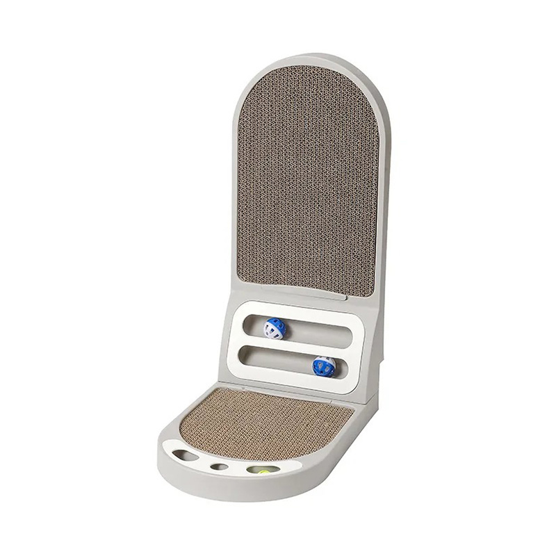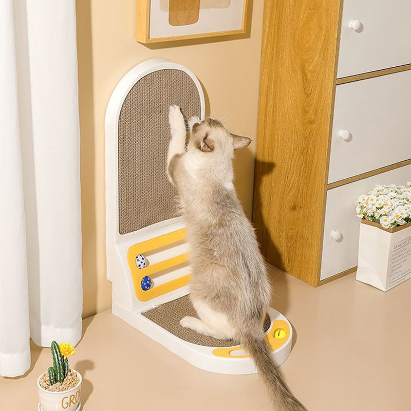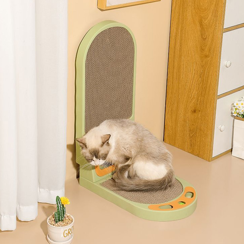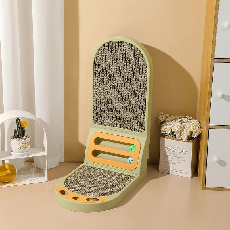 El rascador es principalmente verde con detalles en naranja, lo que añade un toque vibrante a su apariencia. Las superficies superior e inferior están cubiertas con un material corrugado duradero que proporciona una textura ideal para que los gatos afilen sus garras. La sección central incluye dos juguetes para gatos incorporados, que están diseñados para atraer y entretener a los compañeros felinos, alentándolos a usar el rascador con regularidad.