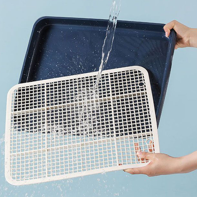 Hay columnas dentro del inodoro, que se pueden usar con arena para gatos o almohadillas para orina para ayudar a absorber la orina y reducir el olor. La altura de la columna es moderada, lo que puede evitar eficazmente que la arena para gatos salpique sin obstaculizar el uso de mascotas. El diseño de rejilla del inodoro ayuda a drenar el agua rápidamente, mantenerla seca y reducir el crecimiento bacteriano.